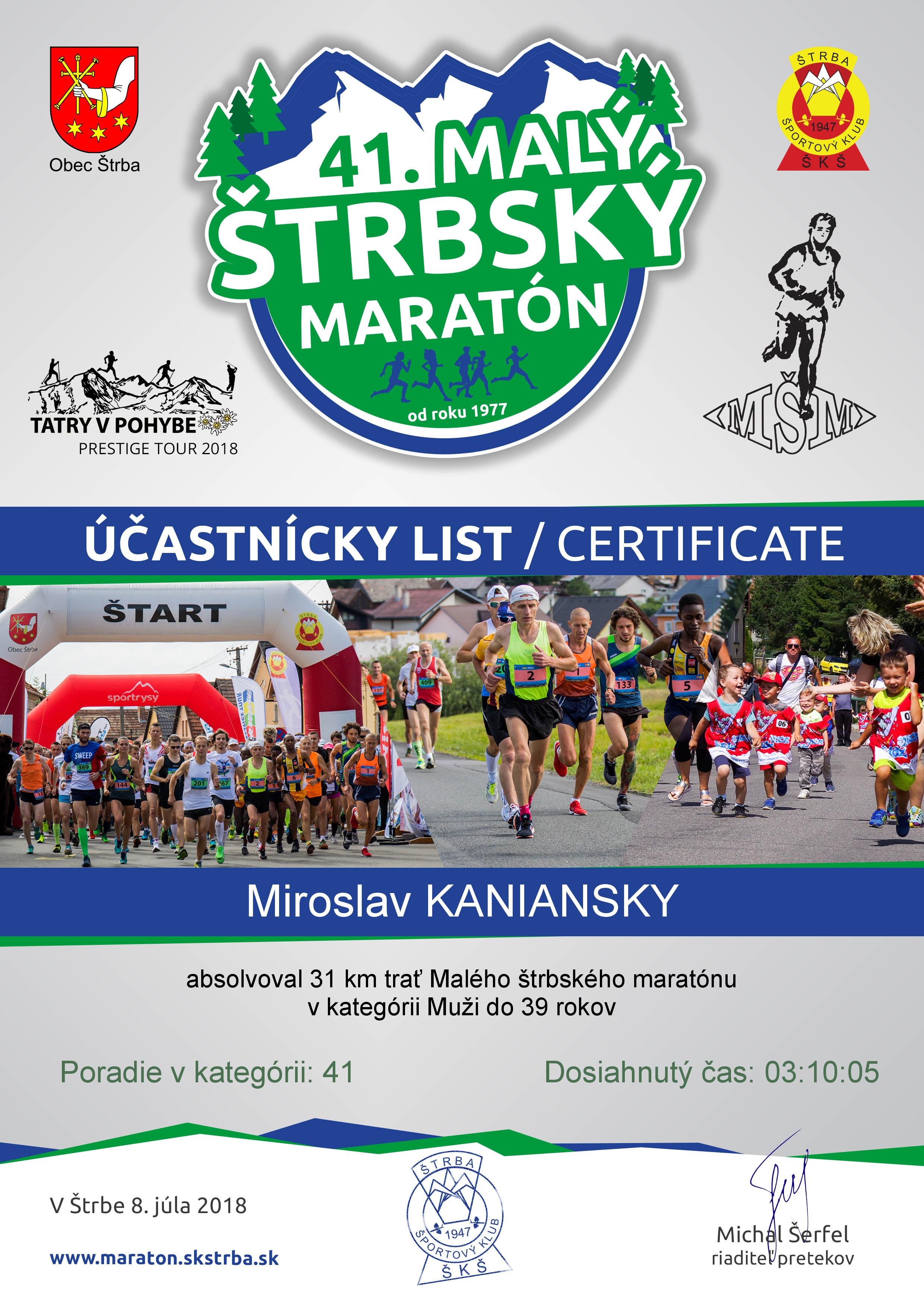 Účastnícky list pretekára KANIANSKY Miroslav