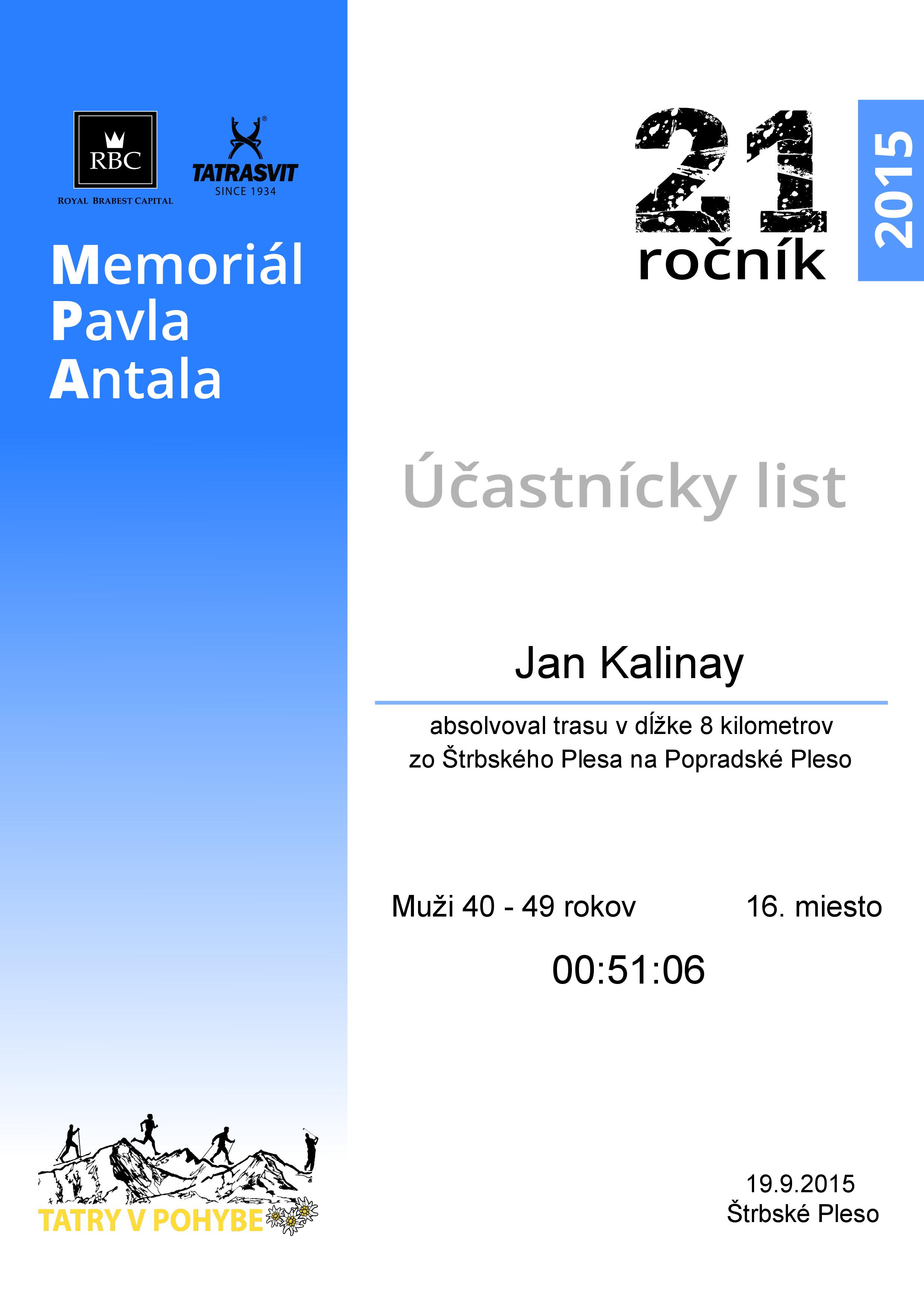 Účastnícky list pretekára Kalinay Jan