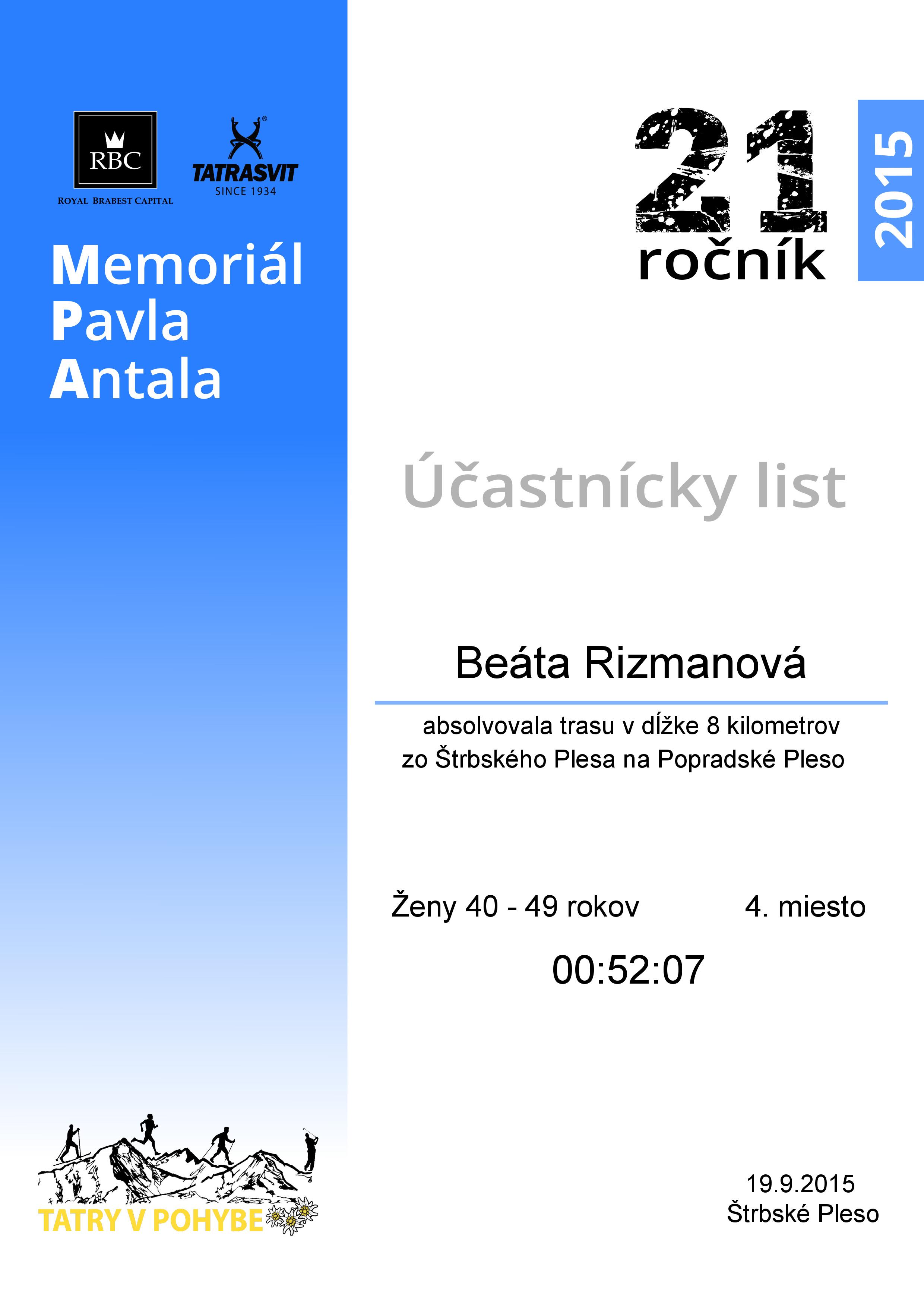 Účastnícky list pretekára Rizmanová Beáta
