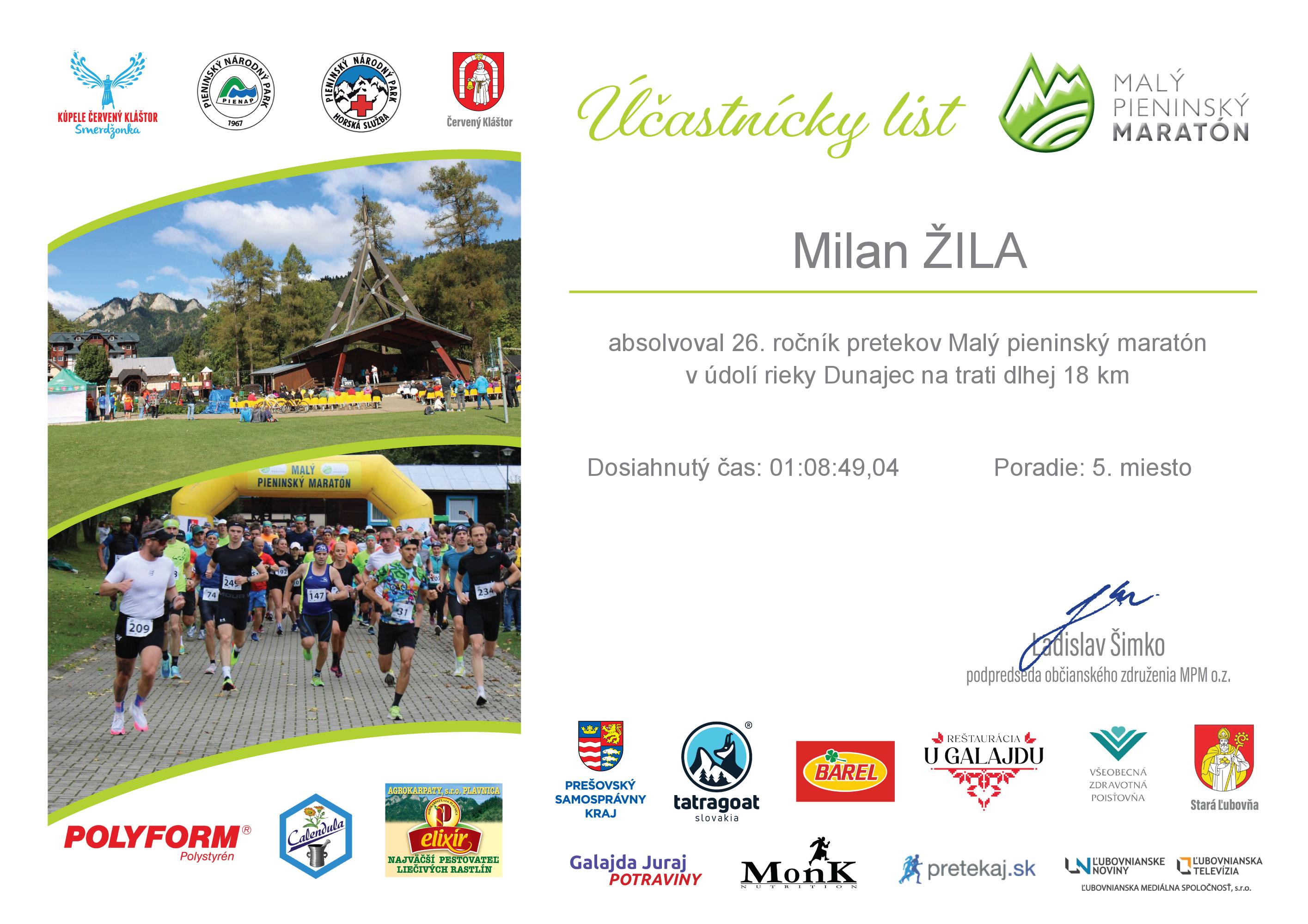 Účastnícky list pretekára ŽILA Milan
