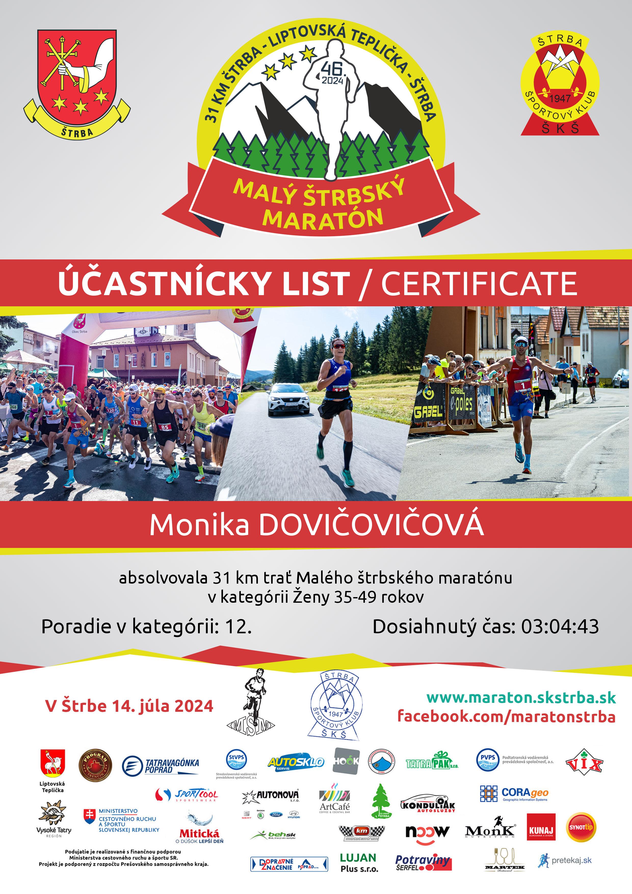 Účastnícky list pretekára DOVIČOVIČOVÁ Monika