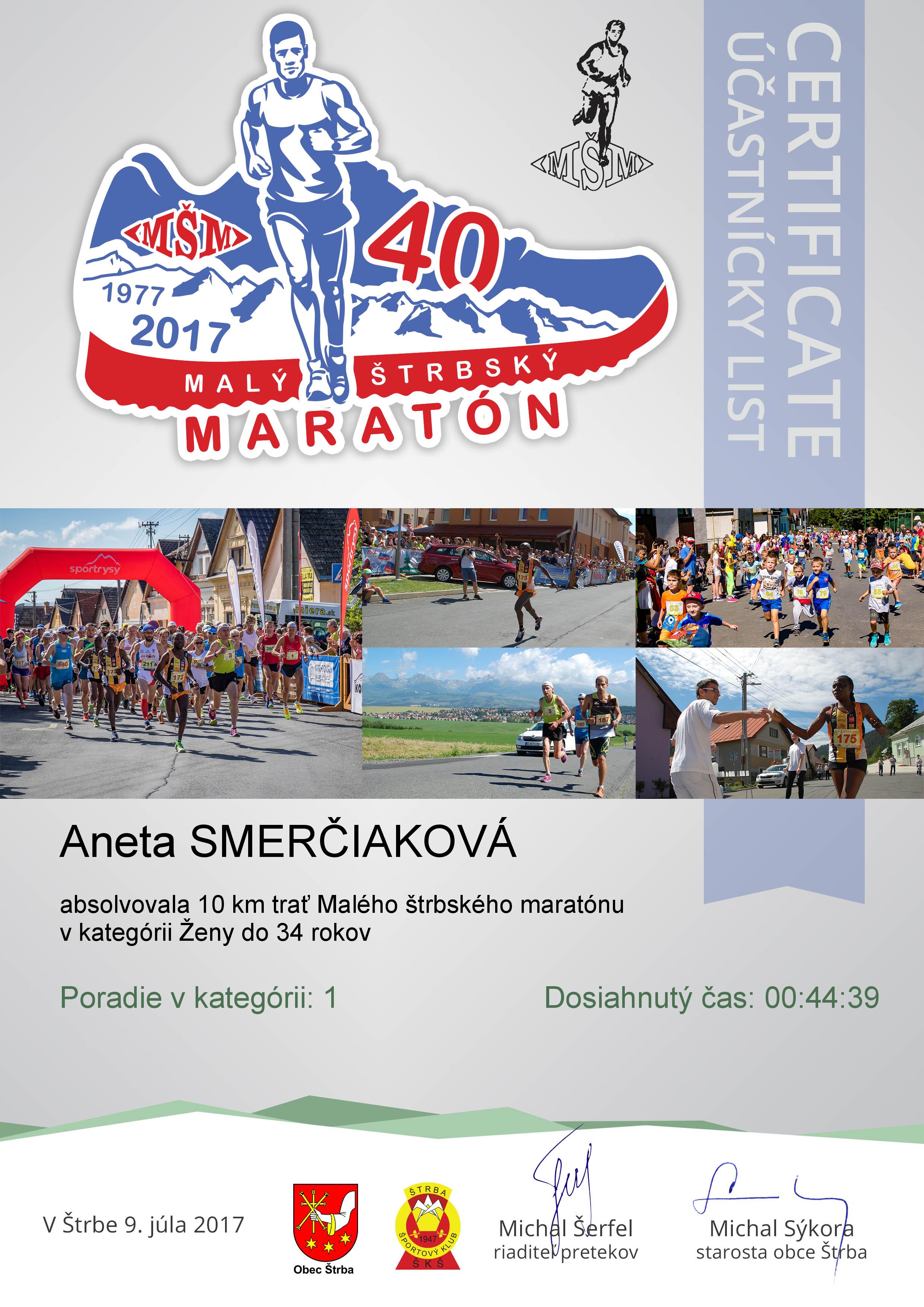 Účastnícky list pretekára SMERČIAKOVÁ Aneta