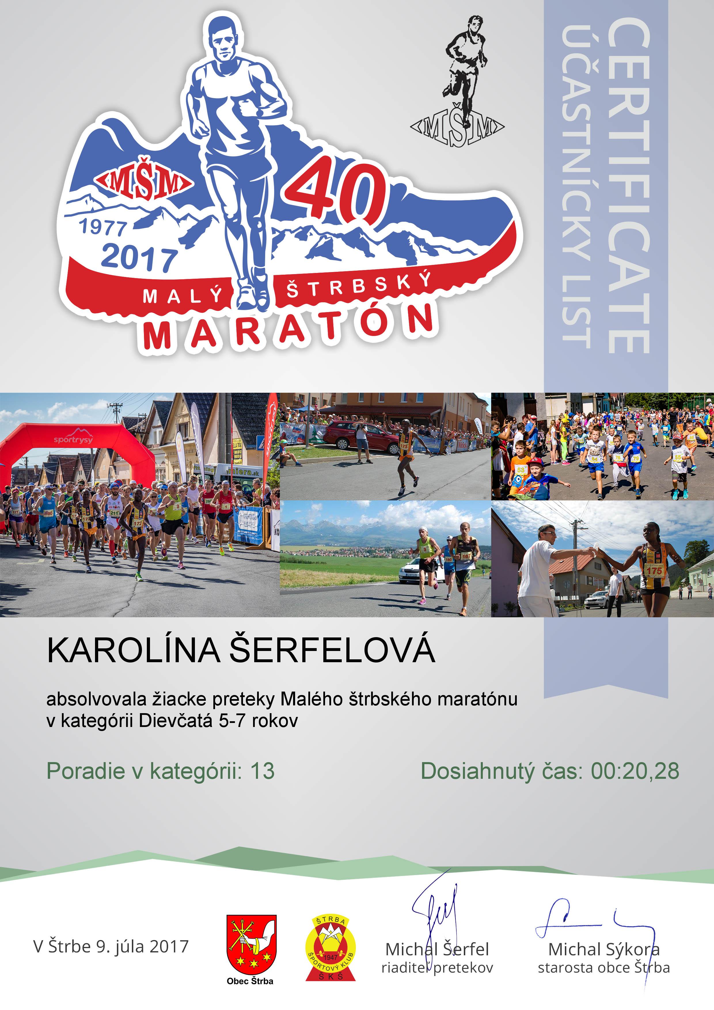 Účastnícky list pretekára ŠERFELOVÁ Karolína