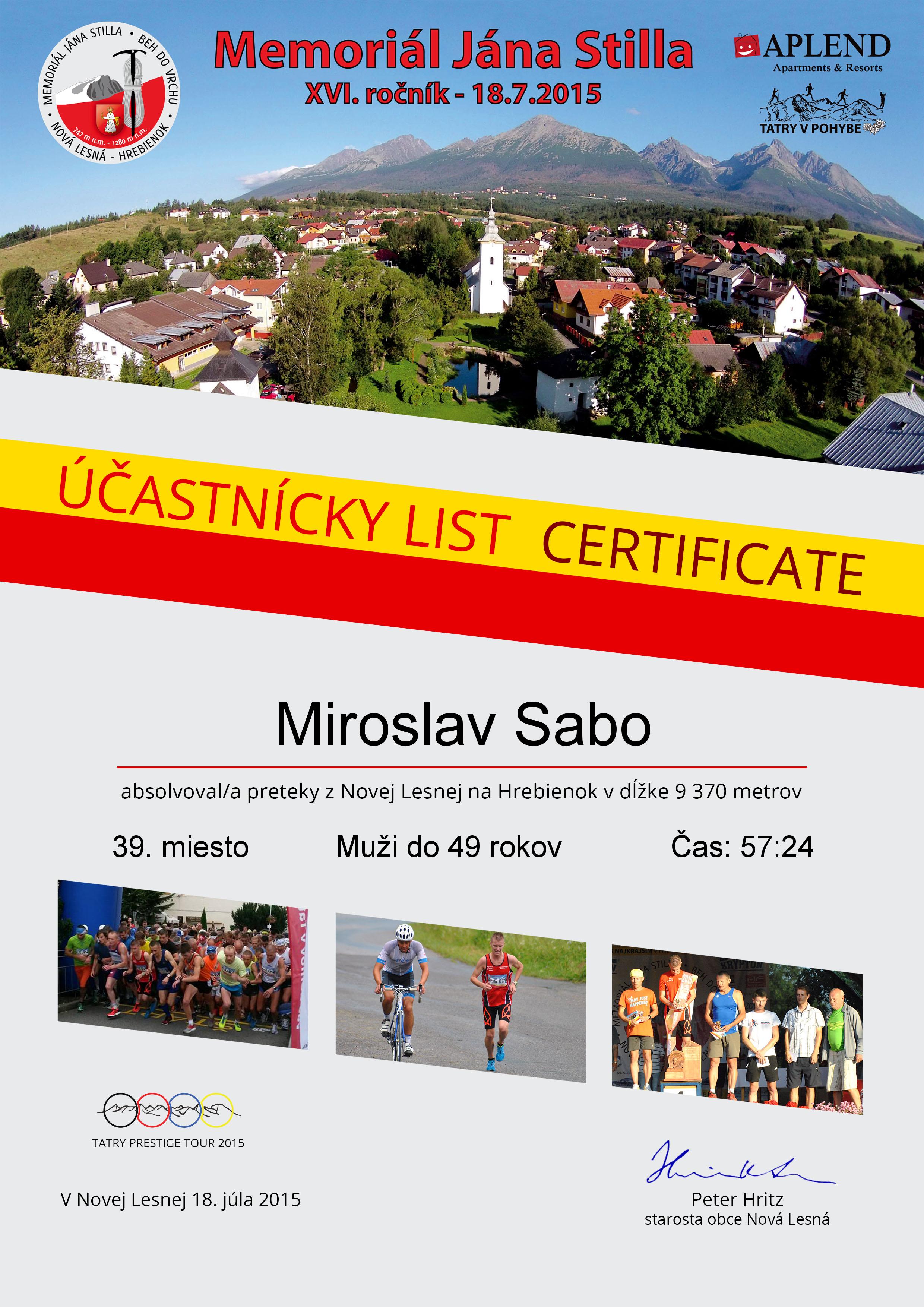 Účastnícky list pretekára Sabo Miroslav