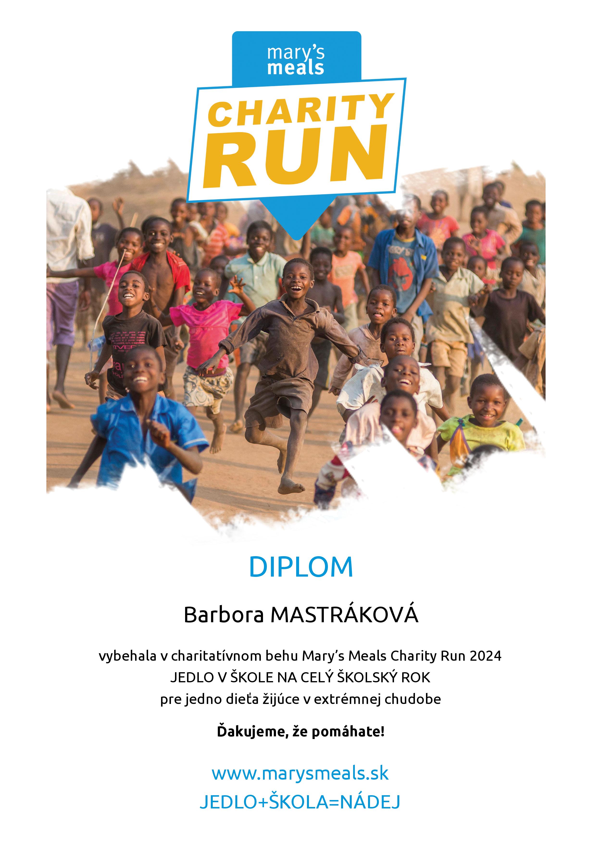 Vybehajte šťastnejšiu budúcnosť pre hladujúce deti. Charitatívny beh Mary’s Meals Charity Run je výnimočný beh, ktorého štartovné sýti hladujúce deti. Mary's Meals je charitatívne dielo, ktoré poskytuje školské jedlo pre viac ako 2,4 milióna detí žijúcich v extrémnej chudobe a umožňuje im tak získať vzdelanie. Štartovným vo výške 22Eur zabezpečíte stravovanie jedného dieťaťa počas celého školského roka. Zabehnúť si môžete fyzicky na podujatí v Dolnom Kubíne, alebo virtuálne - kdekoľvek a kedykoľvek trasu podľa výberu. Cieľom tohtoročného charitatívneho behu je vybehať jedlo pre 621 detí zo školy v Kalungwizi v Zambii.