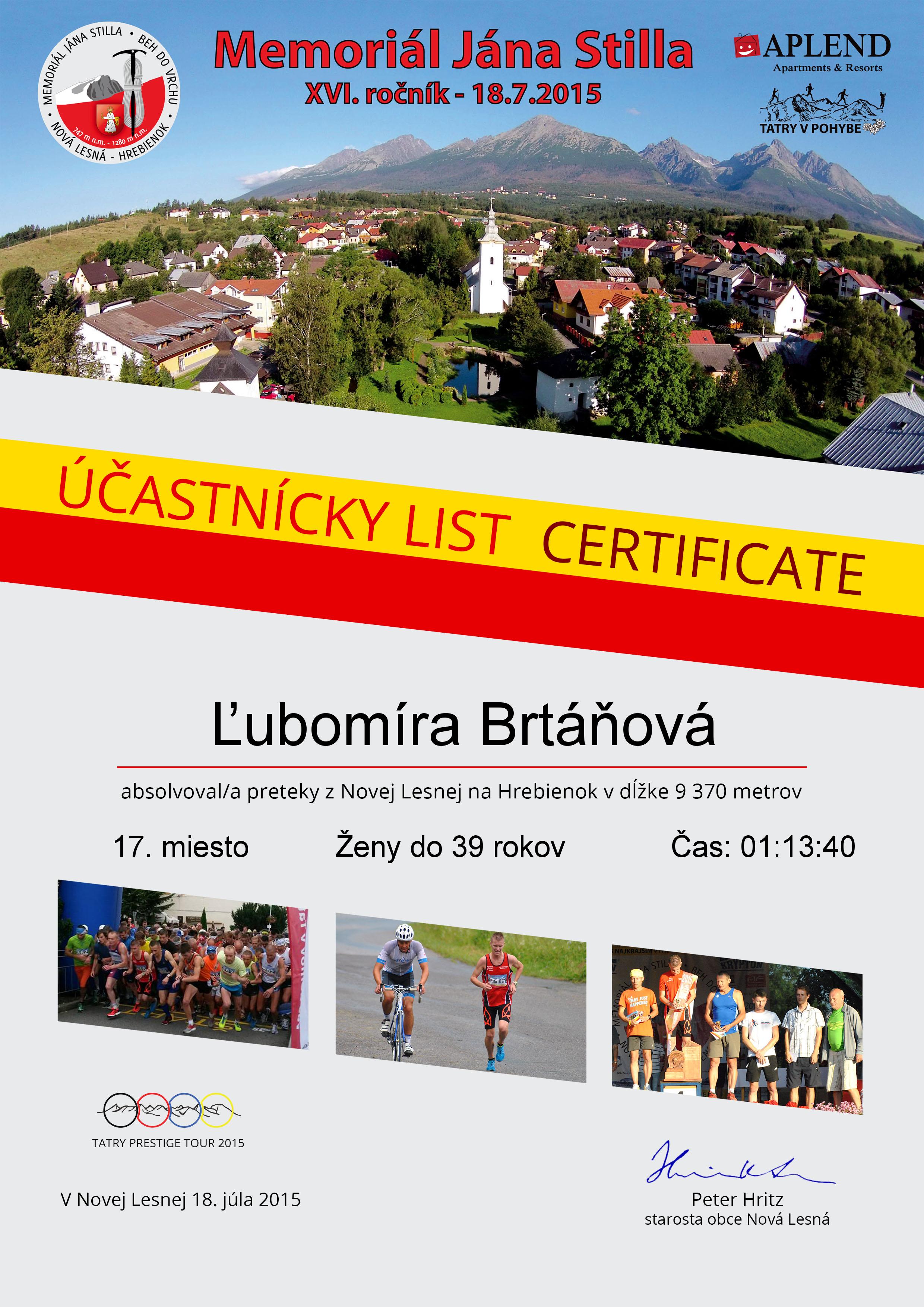 Účastnícky list pretekára Brtáňová Ľubomíra