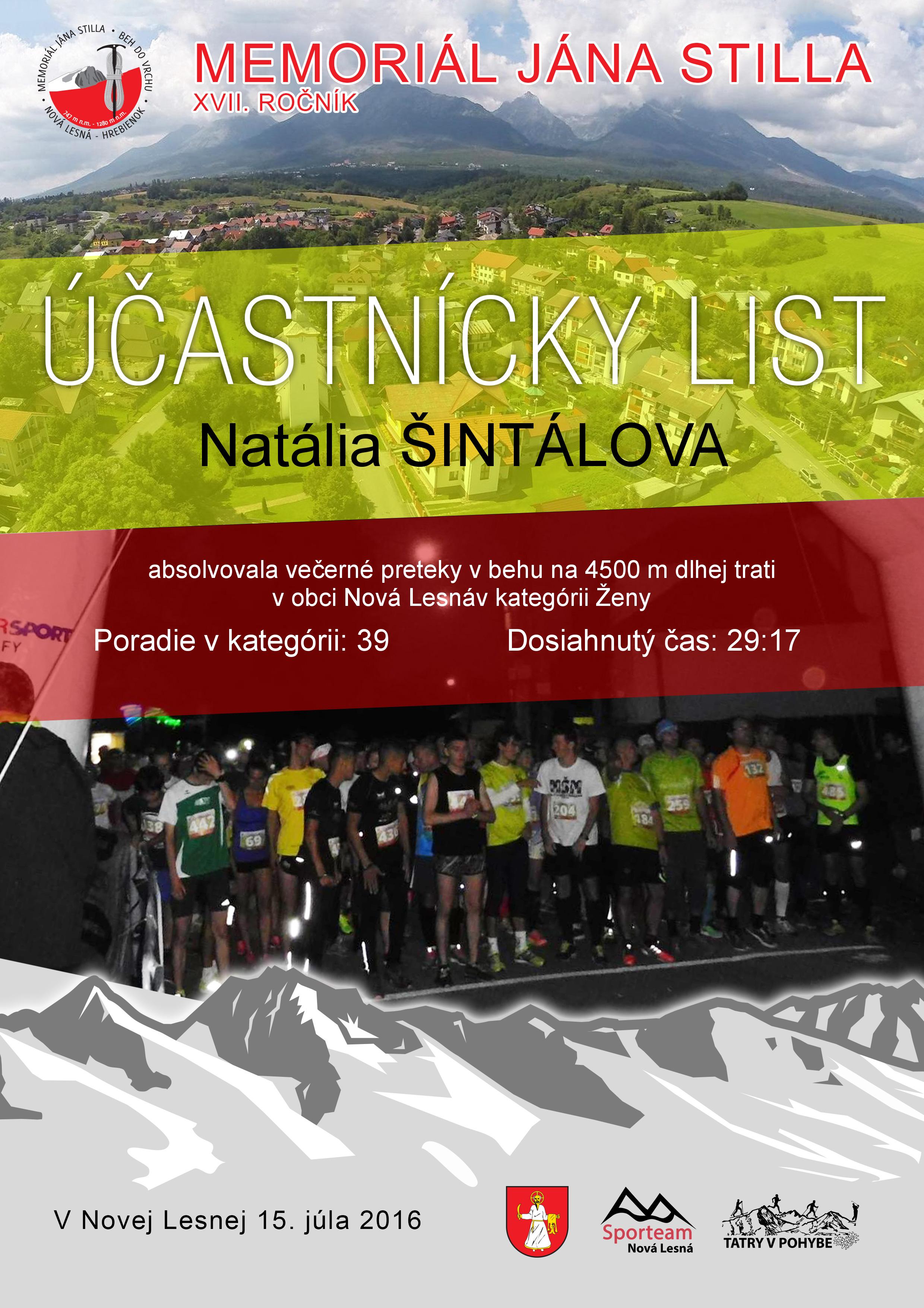 Účastnícky list pretekára ŠINTÁLOVA Natália