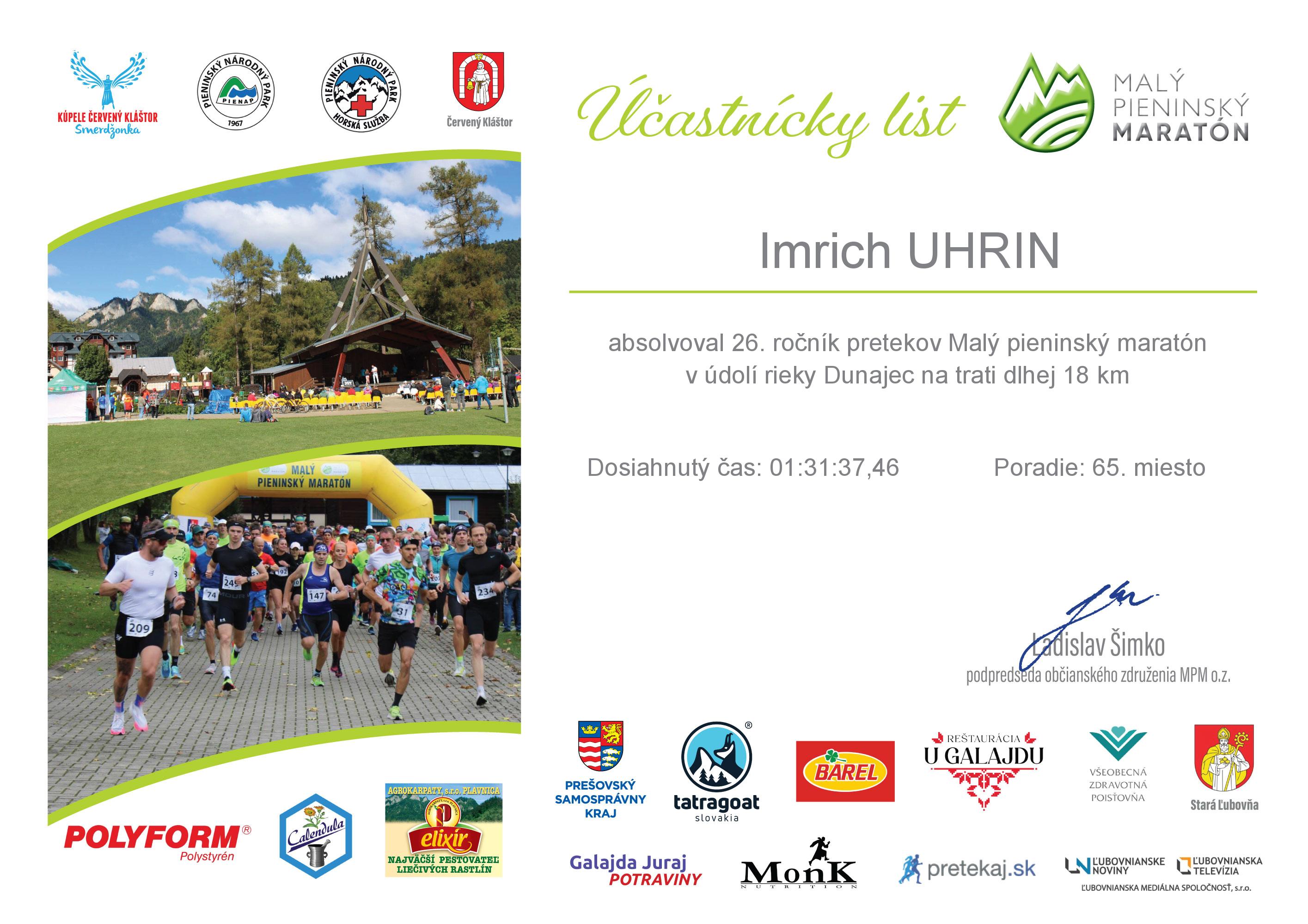Účastnícky list pretekára UHRIN Imrich